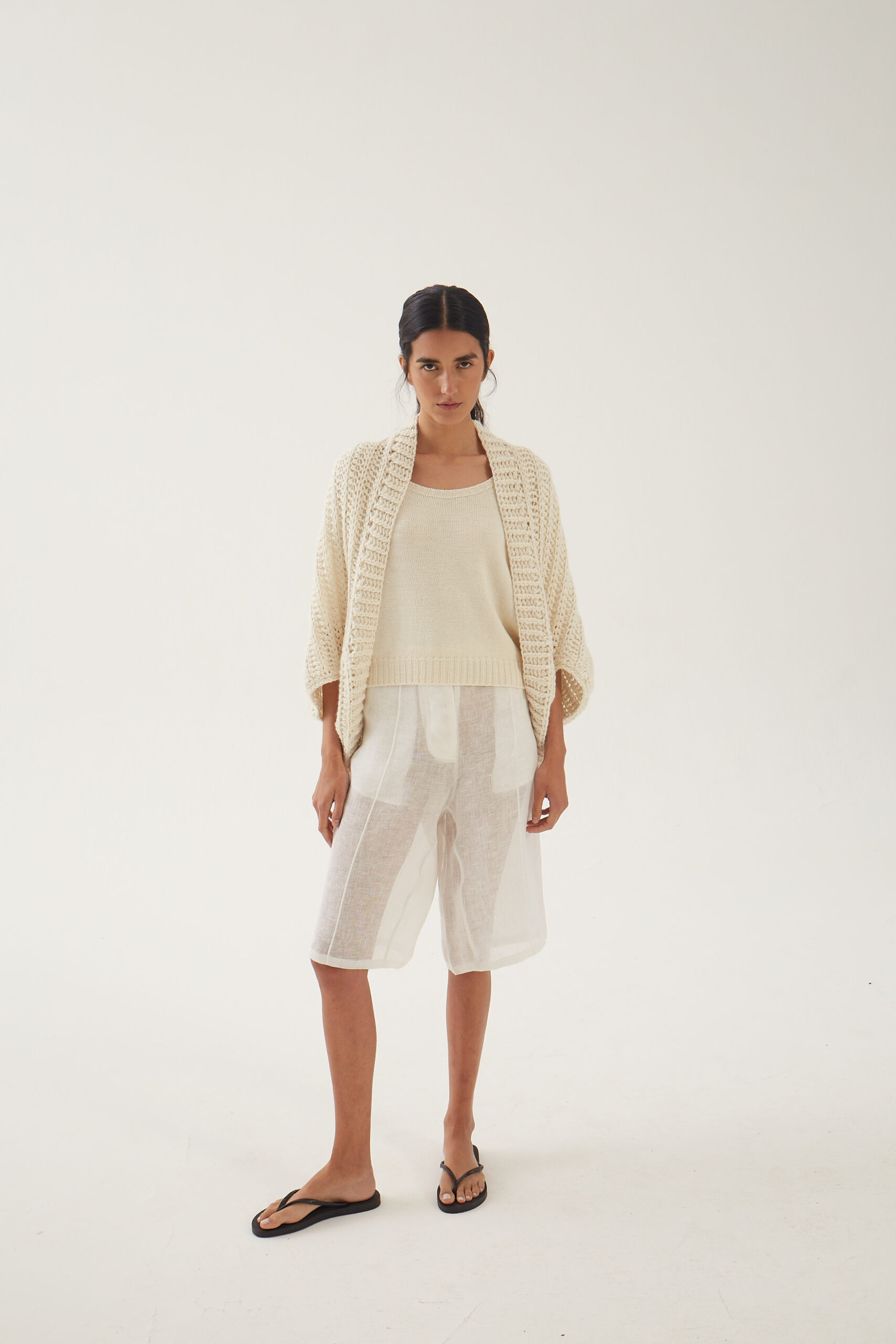 Kimono tejido a mano con dobladillo acanalado,  35% Lana Merino / 35% Cañamo / 30% Bambu