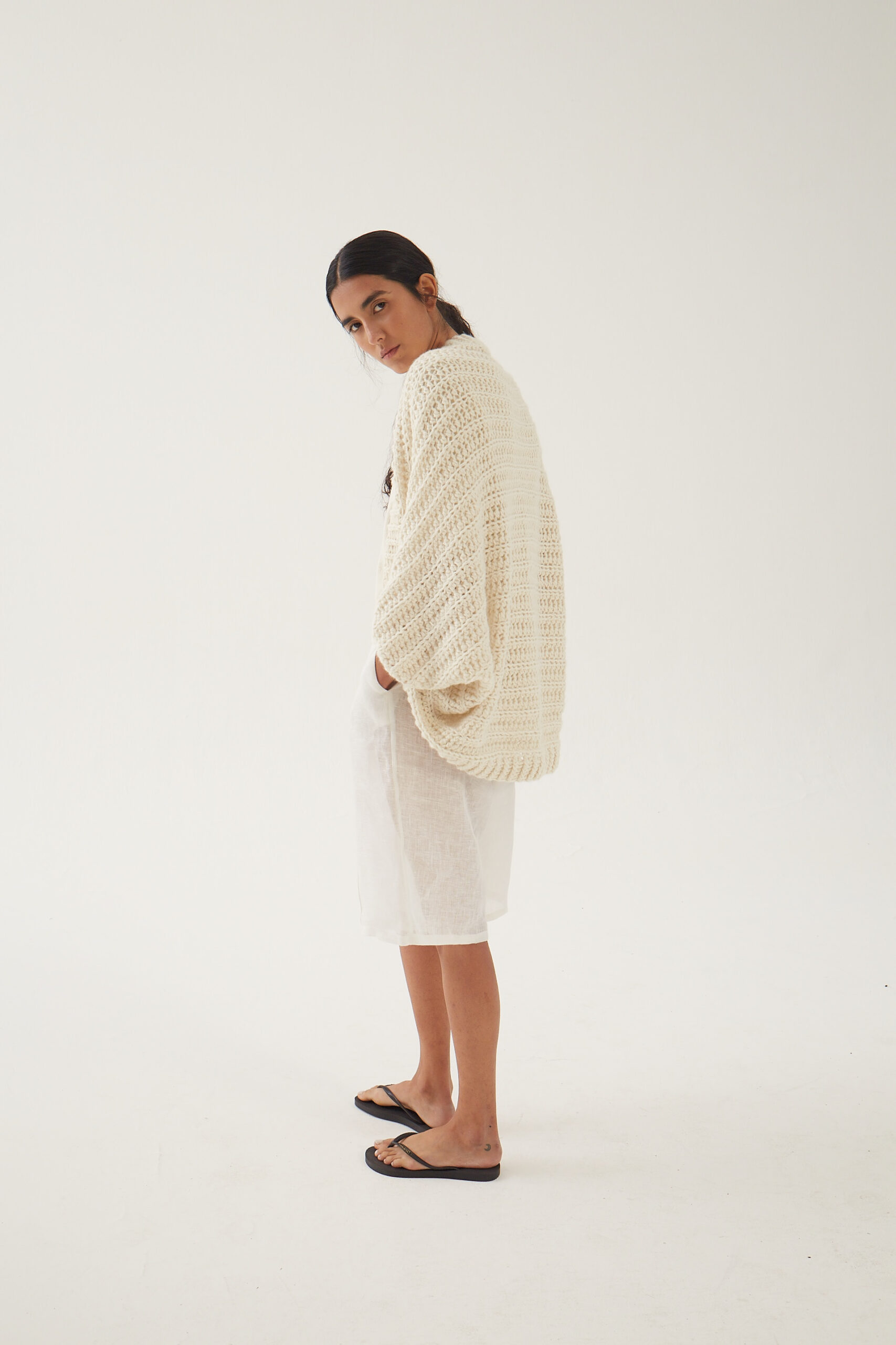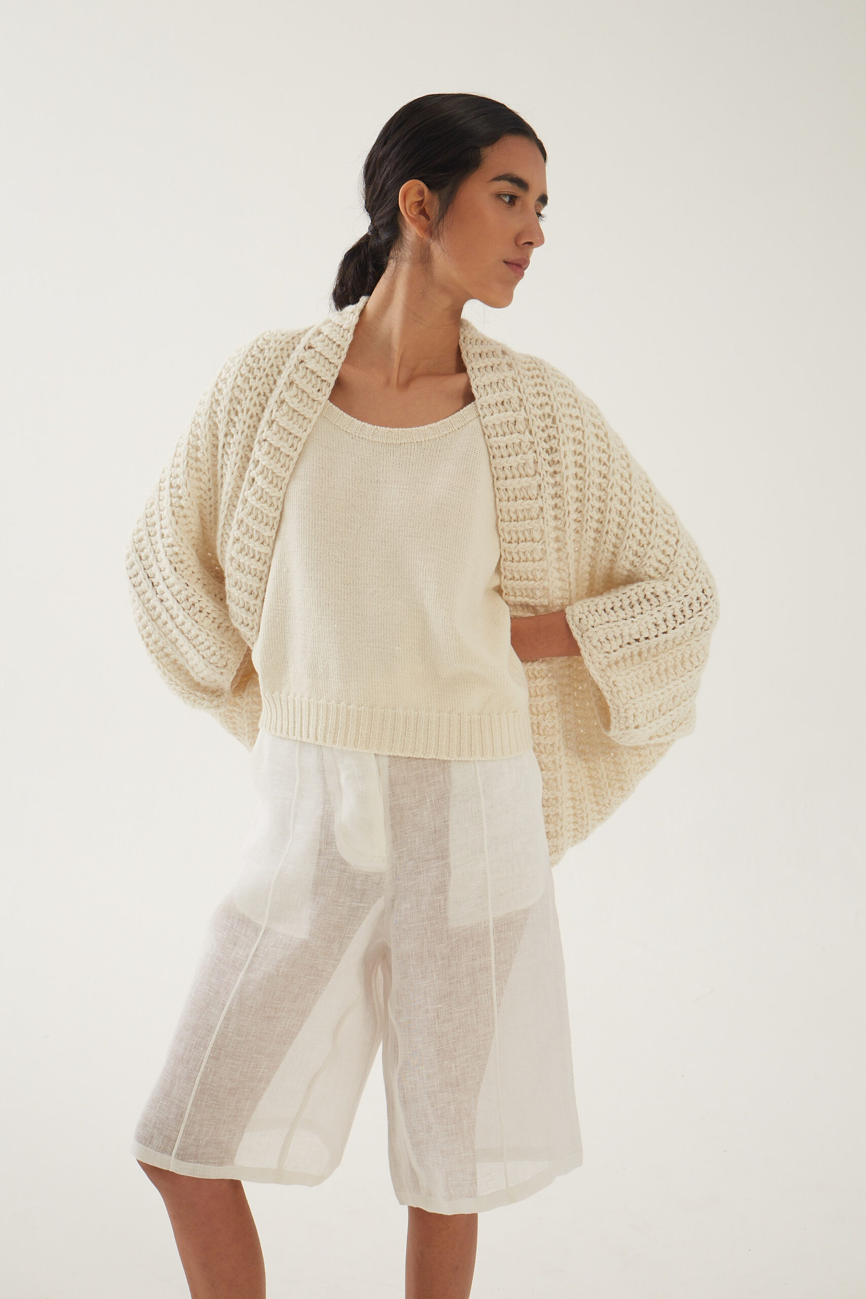 Crochet hand-knitted Kimono ribbed hem, 35% Merino wool / 35% Hemp / 30% Bamboo