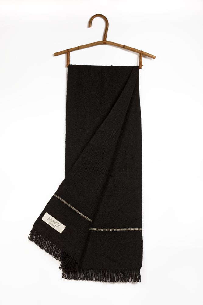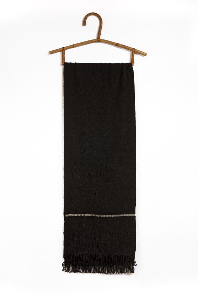 Loom-woven scarf from black baby alpaca and thread detail with 192 threads