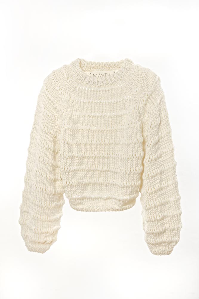 This Cascadas sweater puffed sleeves and ribbed neckline, cuffs and hem is made by mohair wool from a small cooperative from Patagonia.