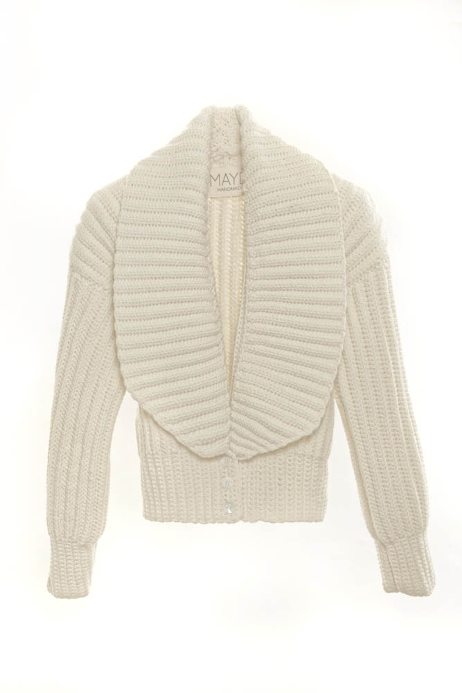 This Lihuen jacket 2/2 Rib stitch spread collar puffed sleeves pearl buttons is made from a fine Merino wool 17 microns from Patagonia.