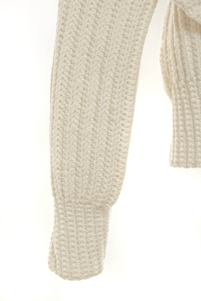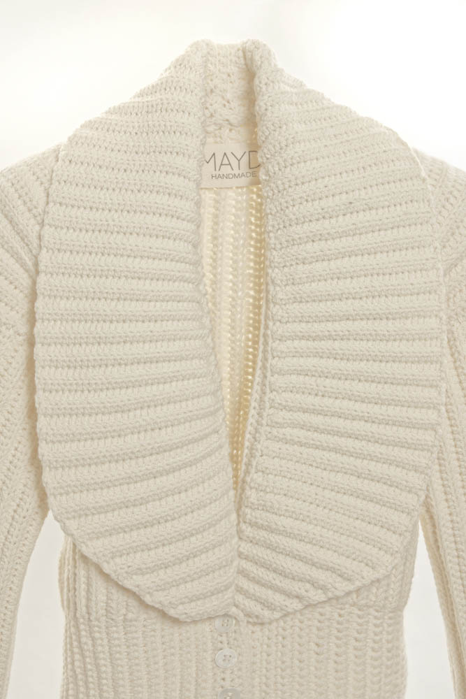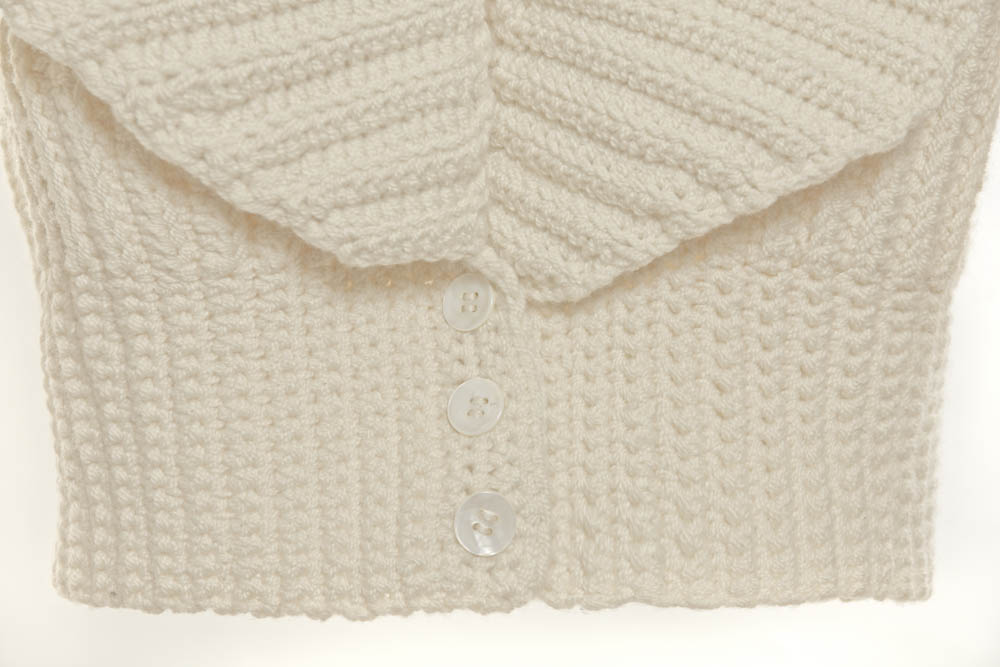 Lihuen Chaqueta punto bajo 2/2 con cuello solapa, mangas abullonadas y botones de nácar en fina lana merino de 17 micrones de Patagonia.