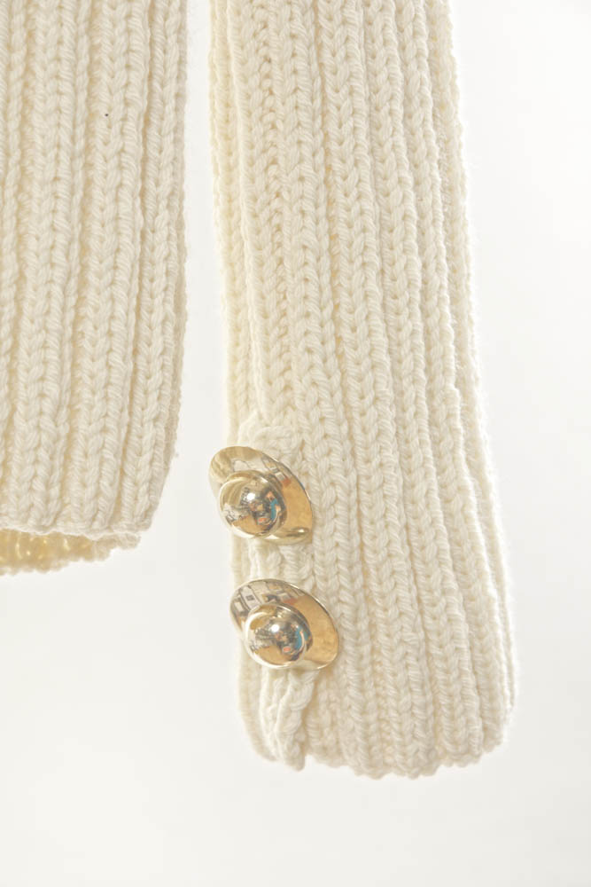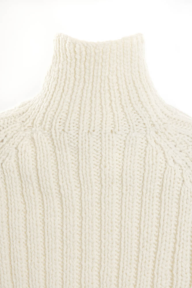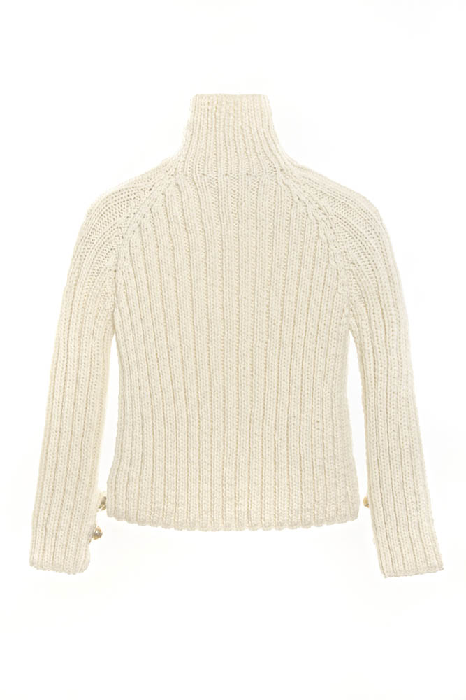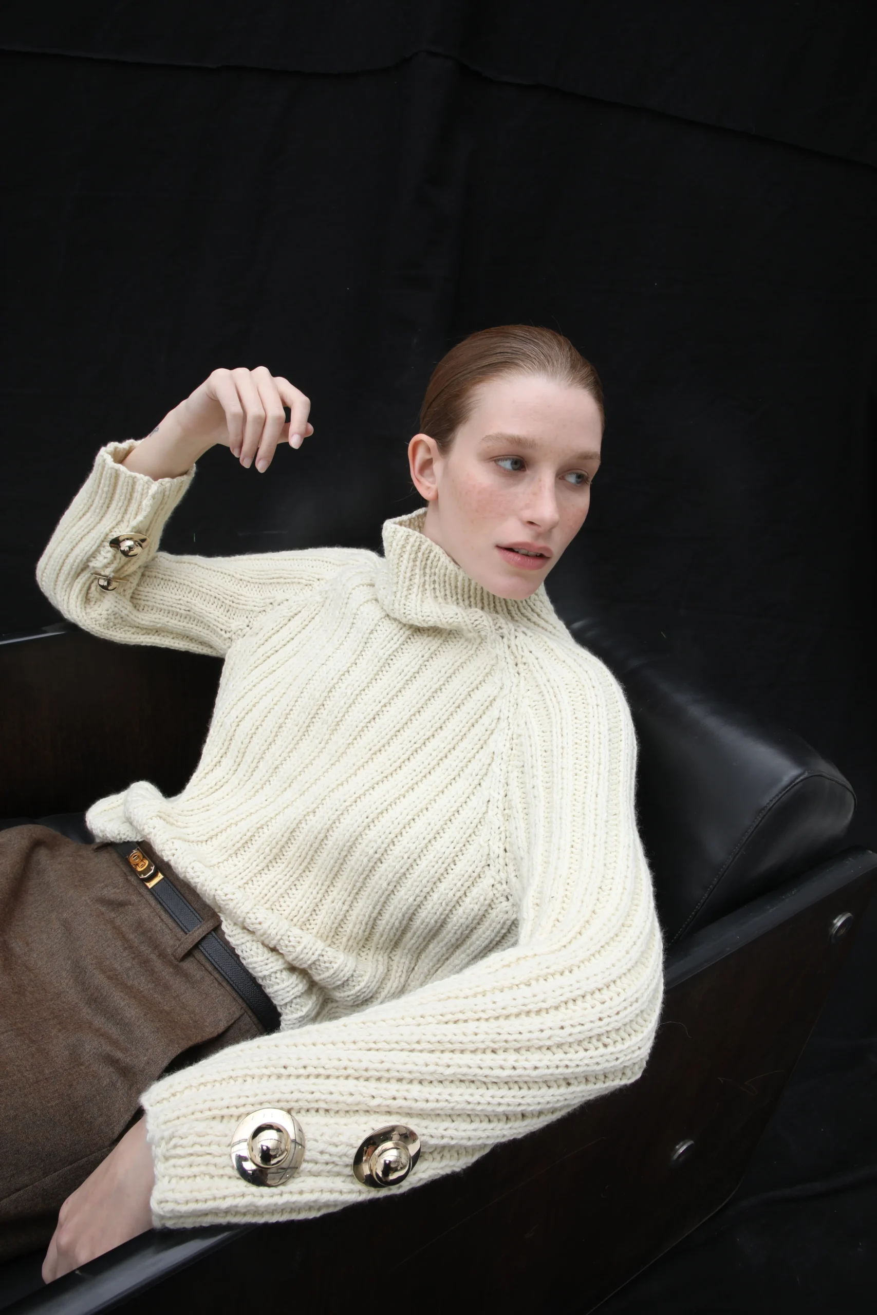 Pucón Sweater cuello alto, mangas largas raglán, punto canalé 2/2, botones dorados en los puños, tejido a mano con lana Merino súper suave de 18 micras de la Patagonia.