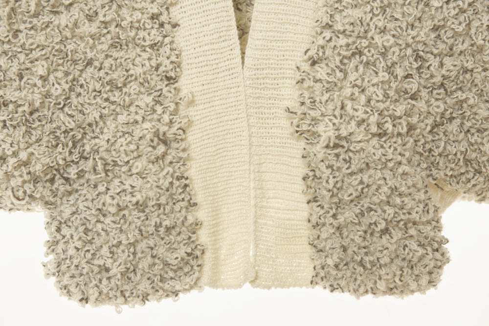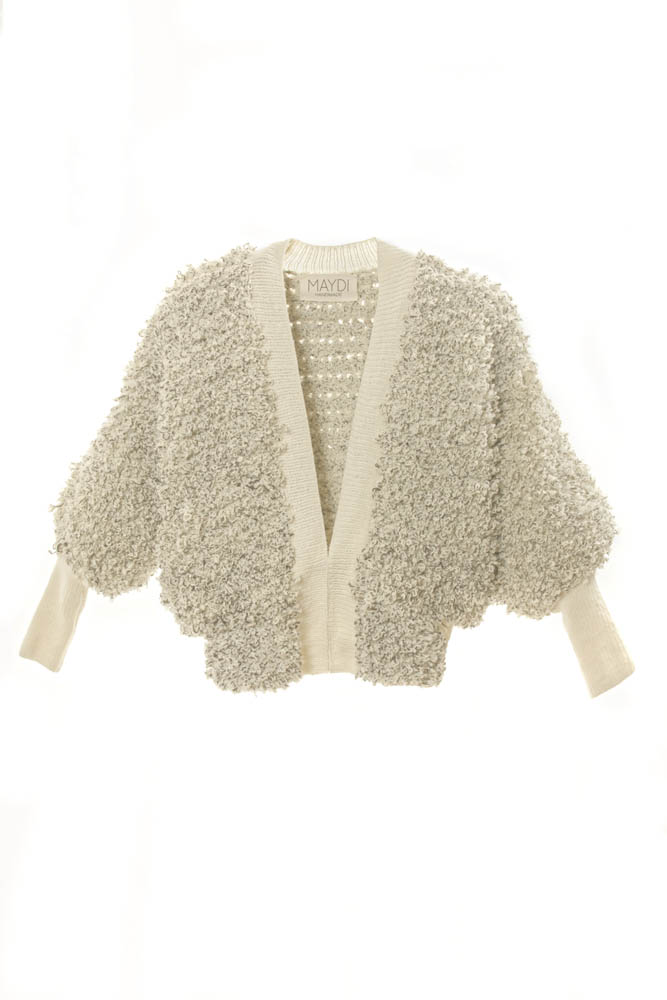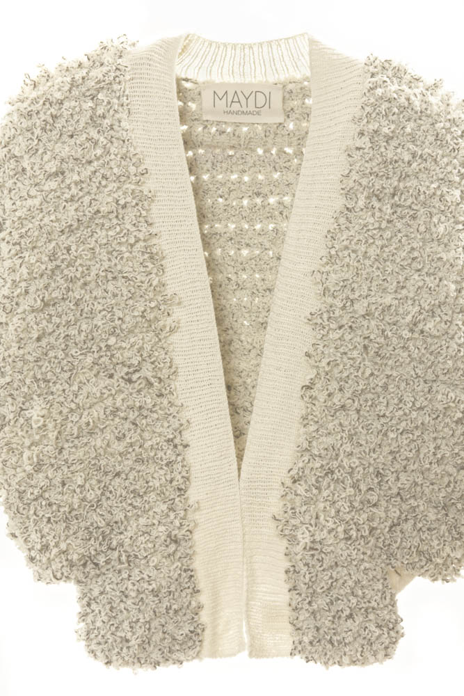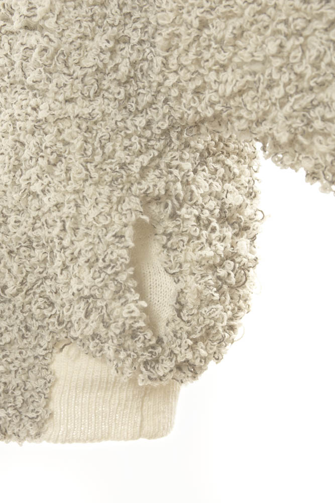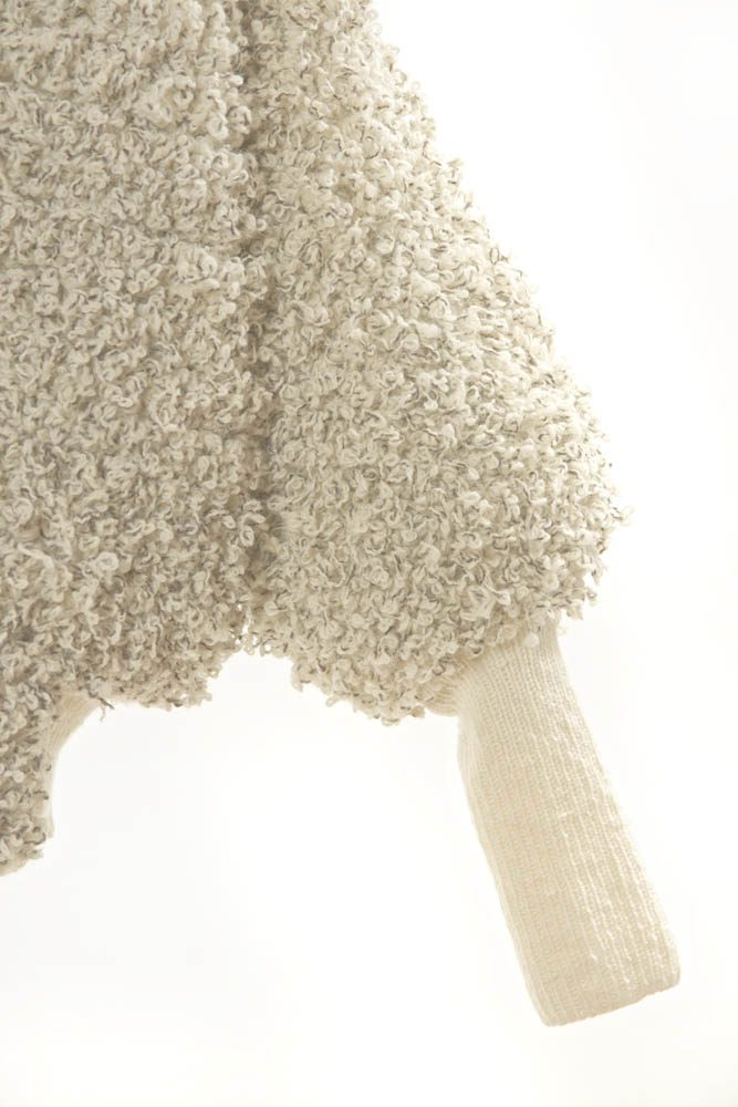 The Rayen bomber jacket with pockets hand-crochet from boucle llama wool natural dye, ribbed cuffs and hem.